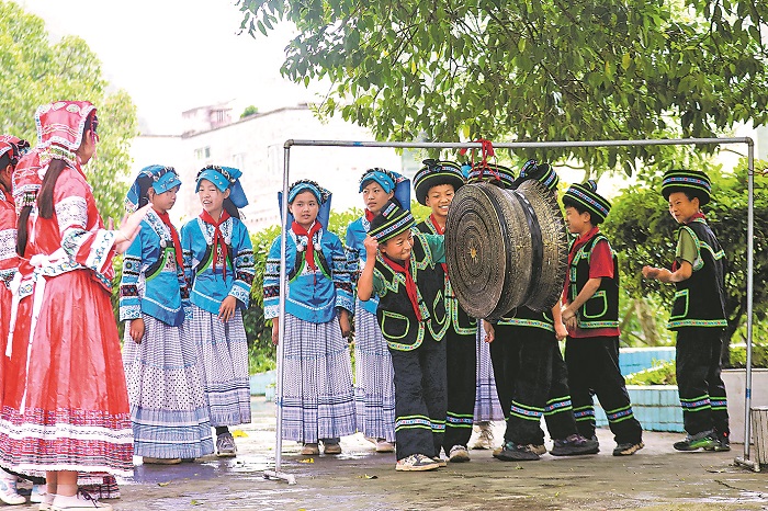 5月17日,貴州省黔西市鐘山鎮(zhèn)治中小學(xué)的布依族教師,在課間教孩子們打擊布依族銅鼓。近年來(lái),該小學(xué)把當(dāng)?shù)氐牟家雷邈~鼓打擊文化引進(jìn)校園,豐富校園文化生活,弘揚(yáng)和傳承民族優(yōu)秀傳統(tǒng)文化。本報(bào)通訊員 周訓(xùn)超 攝