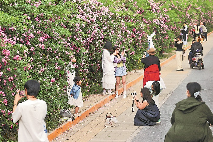 5月14日,在北京奧林匹克森林公園北園東側(cè)安立路旁,游客們?nèi)齼蓛稍谒N薇花墻前拍照打卡。5月以來,北京的薔薇花競相開放。此處薔薇花墻綿延千米,如瀑布般垂下,自成一道亮麗的風(fēng)景線,吸引了眾多市民、游客駐足觀賞,成為新晉的網(wǎng)紅打卡地。