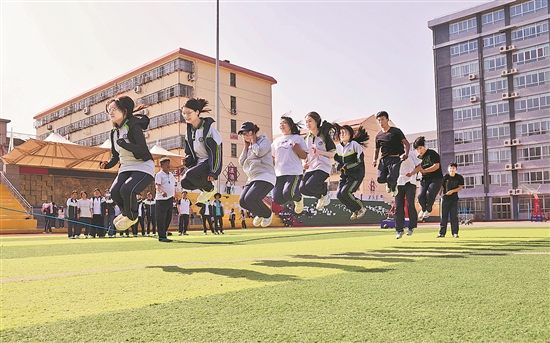 5月14日,山東臨沂第七中學高三學生在跳繩。高考臨近,各地多所高中舉辦特色活動,幫助高三學生釋放壓力,放松心情,以樂觀、自信的心態(tài)迎戰(zhàn)高考。新華社發(fā)(許傳寶 攝)