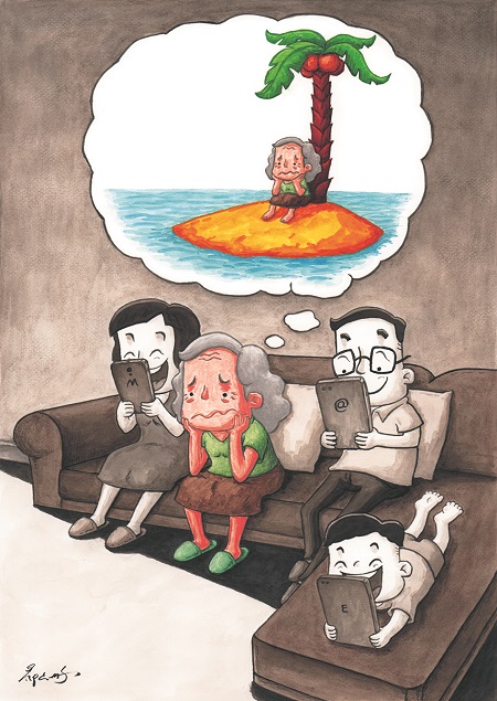 看過這幅作品,有人想笑,有人想哭,也有人啼笑皆非。對(duì)照自身和周圍的世界,我們能夠理解空巢老人的不易,我們每天都在見證低頭族正在經(jīng)歷什么樣的人生。漫畫《孤獨(dú)》用藝術(shù)化的語言闡釋了老人的遭遇:她的這場(chǎng)經(jīng)歷,如同口渴多日的人,眼前出現(xiàn)三瓶飲料,然而還來不及興奮,就發(fā)現(xiàn)哪一瓶都喝不到嘴里。這是怎樣的難忍和無奈?