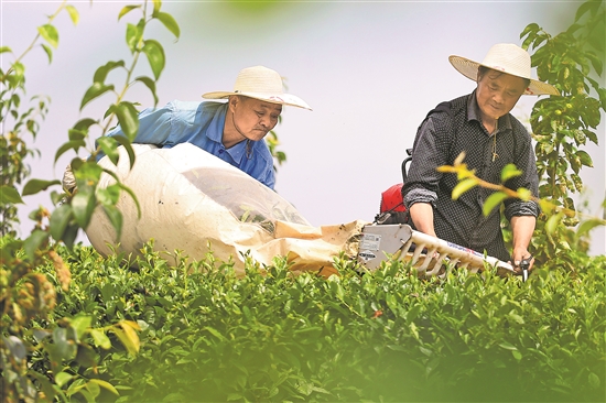 5月20日,茶農(nóng)用采茶機在江蘇省鎮(zhèn)江市句容市下蜀鎮(zhèn)窯業(yè)茶場采收夏茶。