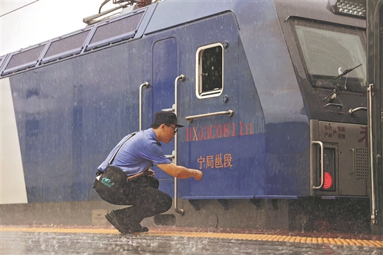 5月19日,廣西部分地區(qū)雨勢強勁,南寧、欽州、防城港均出現(xiàn)了特大暴雨,中國鐵路南寧局集團有限公司南寧車輛段車輛乘務(wù)員在站臺與車廂里來回穿梭,在發(fā)電車里守護列車“心臟”,為旅客平安出行保駕護航。圖為該段車輛乘務(wù)員在南寧站站臺檢查機車與車體連掛狀態(tài)。廖炳達 攝