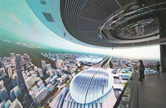5月21日,在雄安新區(qū)雄安站樞紐片區(qū)的中國能建“能建·新能源生態(tài)城”項目展示區(qū)內,游客通過球形大屏了解園區(qū)概況。