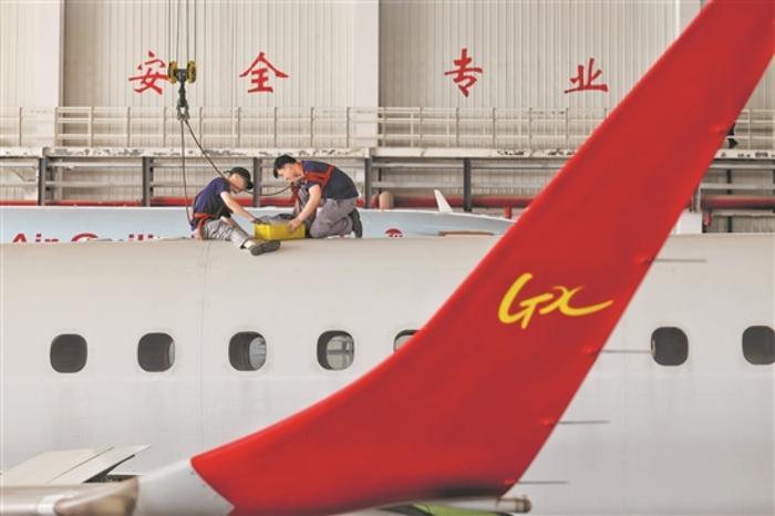 5月22日,在山東省日照市東港區(qū)日照山太飛機(jī)工程股份有限公司高標(biāo)準(zhǔn)機(jī)庫內(nèi),工作人員對飛機(jī)進(jìn)行檢修。