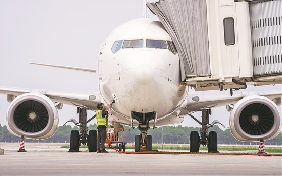 5月22日,湖北宜昌三峽國際機場工作人員為一架到達(dá)的客機接入橋載電源。