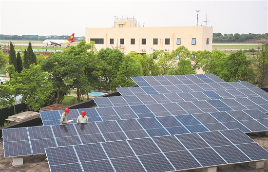 近年來,湖北宜昌三峽國際機場積極推進(jìn)綠色空港電能替代示范項目建設(shè)。該項目通過布局廊橋岸電系統(tǒng)、分布式光伏發(fā)電系統(tǒng)、航站樓能源監(jiān)測系統(tǒng)等,使機場能源利用效率明顯提高,減少有害氣體及碳排放,助力綠色低碳出行。新華社記者 肖藝九 攝