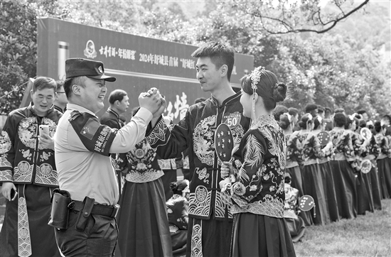 5月20日,安徽省舒城縣“舒城紅·情定萬佛湖”集體婚禮儀式在國家5A級風(fēng)景區(qū)萬佛湖舉行。舒城縣公安局旅游警察大隊積極做好交通疏導(dǎo)、治安保障、提供服務(wù)等工作,持續(xù)營造高質(zhì)量平安旅游環(huán)境。圖為執(zhí)勤輔警向一對新人送祝福。