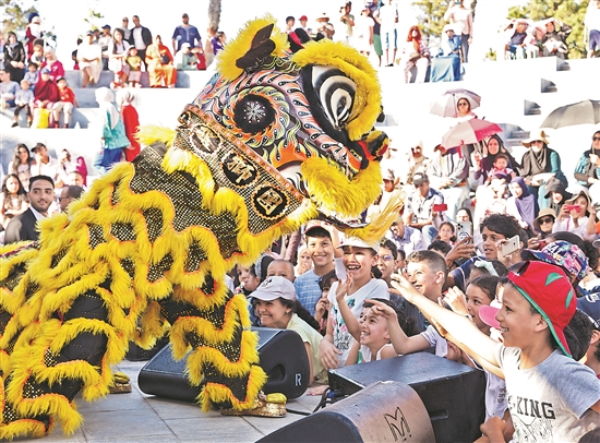 圖為近日,在摩洛哥拉巴特哈桑二世公園劇場的“茶和天下·雅集”活動現(xiàn)場,小朋友和舞獅演員互動。新華社記者 霍晶 攝