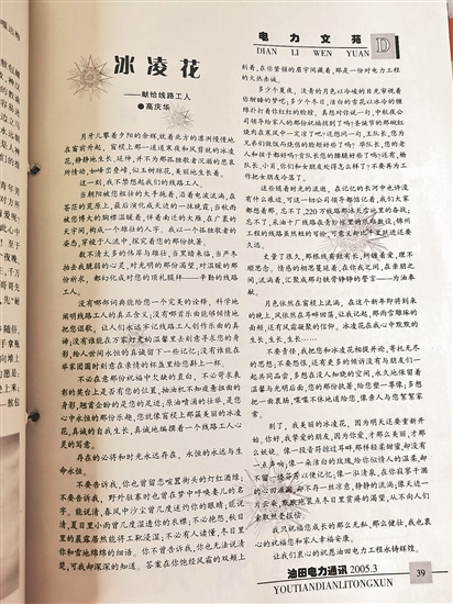 桌上的這摞舊雜志,記錄著許多人的青蔥歲月。在2005年第3期《油田電力通訊》上,有一首散文詩《冰凌花》,其中一段這樣寫道:“不要告訴我,你也曾留戀喧囂街頭的燈紅酒綠;不要告訴我,野外駐扎時也曾在夢中呼喚妻兒的名字……你不曾告訴我,你也無法說清楚,可我卻深深地知道,答案在你飽經風霜的雙頰上刻著,在你緊鎖的眉宇間藏著,那是一份對電力工程的火熱赤誠?!?/p>