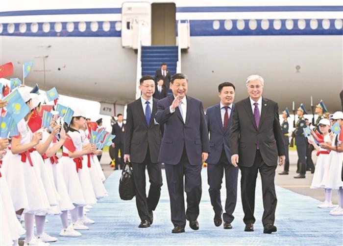 專機(jī)抵達(dá)阿斯塔納納扎爾巴耶夫國際機(jī)場時,哈薩克斯坦總統(tǒng)托卡耶夫率政府第一副總理斯克利亞爾、副總理兼外長努爾特列烏、總統(tǒng)外事顧問卡濟(jì)漢、阿斯塔納市長卡瑟姆別克等高級官員熱情迎接。身著盛裝的哈薩克斯坦女青年向習(xí)近平獻(xiàn)花。