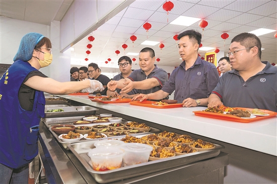 7月2日,在安徽合肥廬陽區(qū)海棠街道海棠花園小區(qū)社區(qū)食堂內(nèi),快遞騎手正在就餐。當日,海棠街道黨工委、總工會為轄區(qū)外賣、快遞騎手發(fā)放社區(qū)食堂就餐券、理發(fā)卡等愛心禮包。本報通訊員 趙明 攝