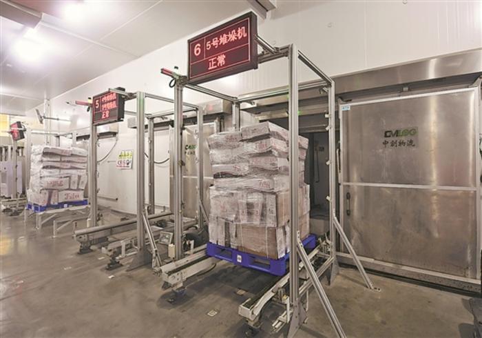在天津東疆綜合保稅區(qū)中創(chuàng)智慧冷鏈有限公司,一批貨物正被AGV自動轉(zhuǎn)運(yùn)小車運(yùn)輸進(jìn)冷凍庫中(7月3日攝)。
