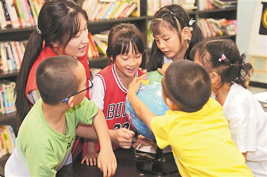 7月4日,在重慶市北碚區(qū)水土街道和悅家園社區(qū),大學(xué)生志愿者在給小朋友介紹地理知識(shí)。暑期,水土街道和悅家園社區(qū)、北碚區(qū)和愛社會(huì)工作服務(wù)中心聯(lián)合開展為期2個(gè)月的“社區(qū)帶娃驛站”公益服務(wù)活動(dòng),招募大學(xué)生志愿者為臨時(shí)輔導(dǎo)教師,為小朋友們提供托管照看服務(wù),與孩子們一起開展文體游戲、手工制作等活動(dòng),豐富孩子們的暑假生活。