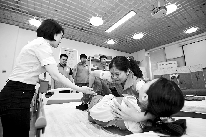 7月2日,一名學(xué)員正在貴陽市南明區(qū)嘉安月嫂科技有限公司職業(yè)培訓(xùn)教員的指導(dǎo)下學(xué)習(xí)家庭護(hù)理中的翻身。近年來,當(dāng)?shù)匾跃蜆I(yè)市場需求為導(dǎo)向,依托轄區(qū)內(nèi)的家政服務(wù)機(jī)構(gòu)開設(shè)“家政技能培訓(xùn)班”,搭建就業(yè)供需平臺,拓寬就業(yè)渠道。本報(bào)通訊員 趙松 攝