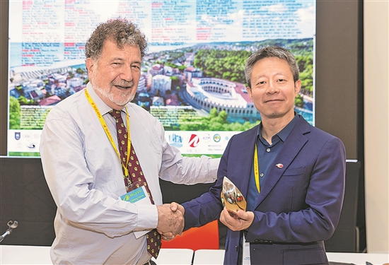 當(dāng)?shù)貢r(shí)間7月9日,在意大利佩斯卡拉,會(huì)議主辦方之一、國際相對論天體物理中心網(wǎng)絡(luò)主任雷莫·魯菲尼(左)為李菂頒獎(jiǎng)。