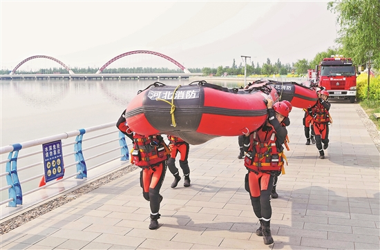 7月10日,河北省張家口市消防救援支隊的消防員在進(jìn)行橡皮艇救援技術(shù)演練。