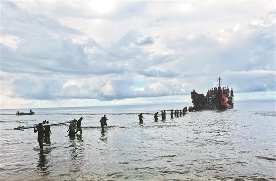 中國援助所羅門群島國家寬帶網(wǎng)絡(luò)項目是兩國標(biāo)志性合作項目之一,由中國港灣工程有限責(zé)任公司和華為技術(shù)有限公司共同實施,按規(guī)劃將在所羅門群島9個省的35個主要島嶼建設(shè)161個3G/4G無線通信基站。項目2023年8月開工,工期3年,首個電信塔已于今年3月在瓜達(dá)爾卡納爾省薩利村接通。圖為近日,在所羅門群島瓜達(dá)爾卡納爾省,當(dāng)?shù)卮迕癜徇\中國援助寬帶網(wǎng)絡(luò)項目所需的物資。新華社發(fā)