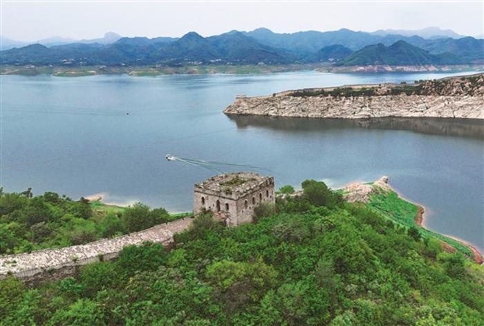 7月13日,在河北承德寬城滿族自治縣境內(nèi)的潘家口水庫,游客乘船欣賞露出水面的長城。據(jù)介紹,這段長城是明長城,20世紀(jì)70年代因建設(shè)潘家口水庫,部分長城隱沒水下,從而形成“水下長城”奇觀。新華社記者 楊世堯 攝
