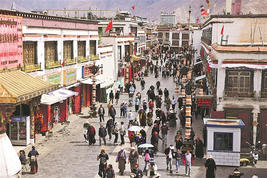 近期,西藏自治區(qū)拉薩市八廓街,游人正在逛街游覽,感受民族風情。