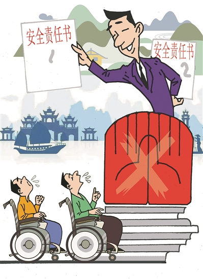 據(jù)華商網(wǎng)報道,近日,陜西西安兩名殘障人士前往某景點游玩,入園前被要求簽署安全責(zé)任書:“殘疾人如無成年人陪同,入園后的一切安全責(zé)任與景區(qū)無關(guān)?!眱扇烁械奖黄缫暎?jīng)過交涉,園方拿出第二份責(zé)任書,依然要求“殘障人士需由有監(jiān)護能力的游客陪同”。