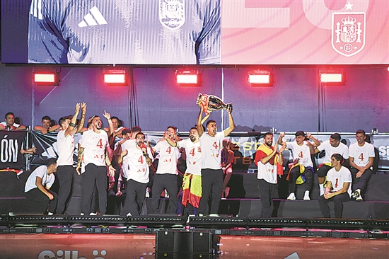 當(dāng)?shù)貢r(shí)間7月15日,西班牙隊(duì)球員高舉歐錦賽冠軍獎(jiǎng)杯,與球迷一同分享奪冠喜悅。
