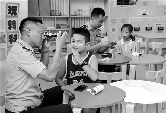 7月15日,四川省蓬溪縣公安局輪休的民警志愿者,在“警娃”暑期托管班欣賞孩子們手工制作的玩具“望遠鏡”。蓬溪縣公安局為了讓民警無后顧之憂,今夏特開設(shè)“警娃”暑期托管班,讓輪休的民警志愿管護“警娃”,讓孩子們度過安全、充實的暑期。本報通訊員 邱海鷹 攝