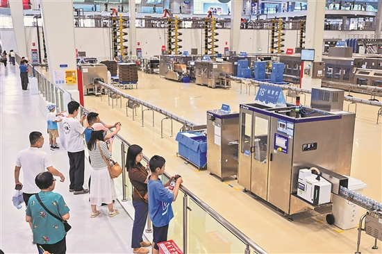 暑假期間,許多游客來到內(nèi)蒙古自治區(qū)呼和浩特市伊利健康谷景區(qū)參觀游覽,走進(jìn)車間,了解乳品生產(chǎn)過程。