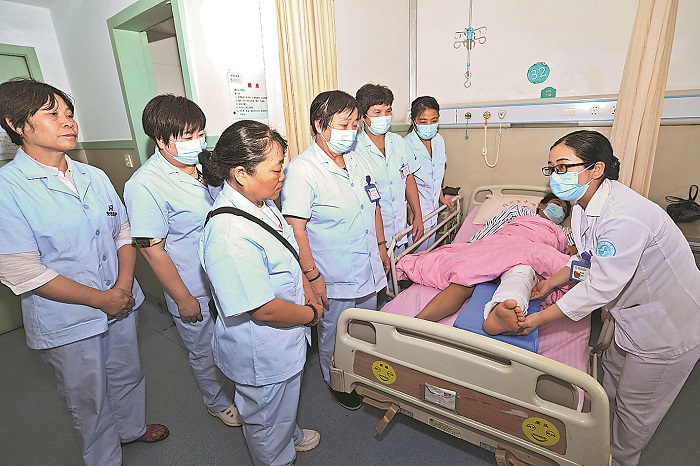 7月25日,在浙江省紹興市中心醫(yī)院骨科病房,護(hù)士長正在考核指導(dǎo)首批“無陪護(hù)”病房護(hù)工。為減輕患者家屬陪護(hù)時間和經(jīng)濟(jì)壓力,該院正式啟動骨科和神經(jīng)外科“無陪護(hù)”試點病房運營,家屬自愿選擇是否陪護(hù),陪護(hù)公司統(tǒng)一調(diào)配專業(yè)護(hù)工,家屬可探視。本報通訊員 單明銘 攝