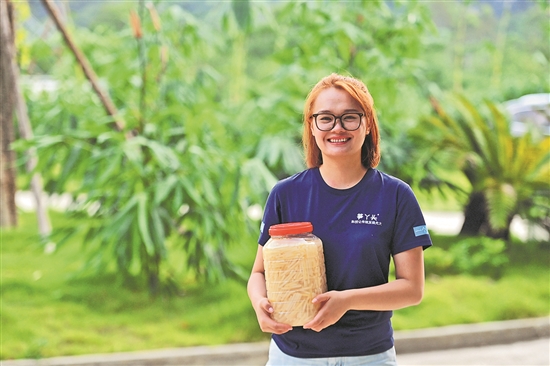 顏茜茜在展示公司生產(chǎn)的酸筍(7月23日攝)。