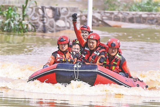 7月29日,在吉林省臨江市,臨江市消防救援大隊世紀大街站副站長白云天(右二)在轉運受困群眾時,用手勢指揮隊員操控船只。