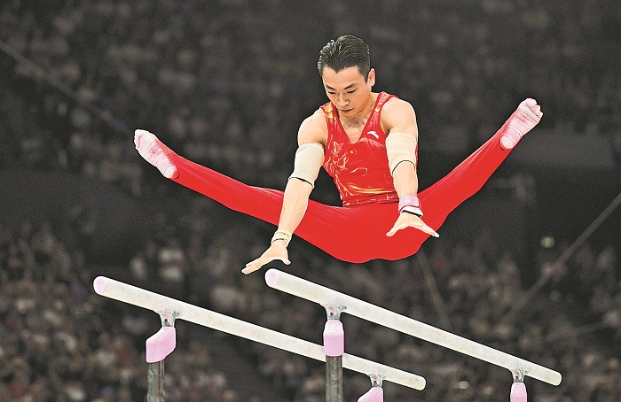 7月29日,鄒敬園在雙杠比賽中。新華社記者 程敏 攝
