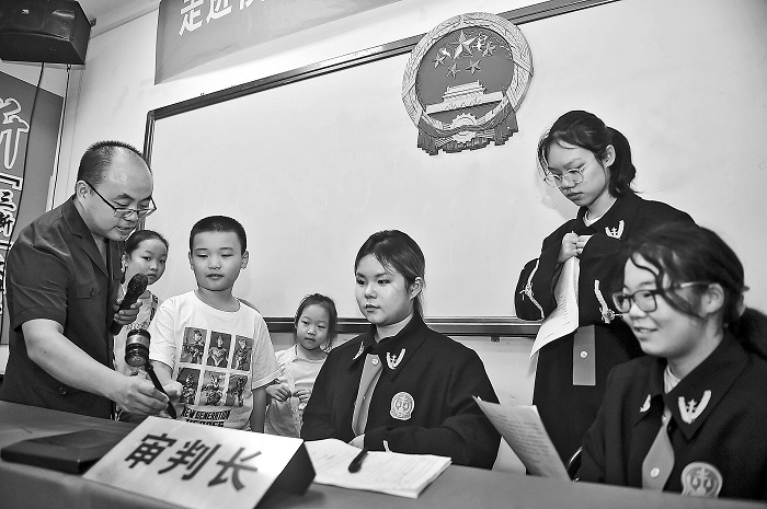 7月29日,河南省洛陽市澗西區(qū)武漢路街道武漢路社區(qū)邀請澗西區(qū)人民法院的法官志愿者,來到社區(qū)“暑期課堂”開展“模擬法庭”活動,并邀請學生們擔任審判長、陪審員、書記員等法庭角色,指導模擬法庭“審理”一起“霸凌案”。