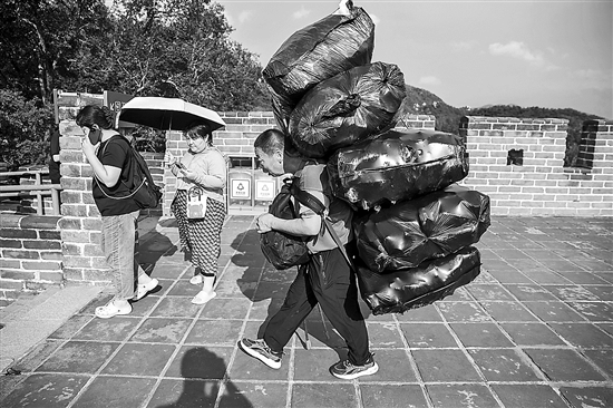 北京八達(dá)嶺長城是大客流景區(qū),每天都有大批中外游客來此觀賞游覽。為維護(hù)景區(qū)環(huán)境清潔,這里有一個由80人組成的保潔隊(duì),成員大部分是來自景區(qū)周邊鄉(xiāng)鎮(zhèn)的村民,負(fù)責(zé)八達(dá)嶺長城北線和南線的垃圾清運(yùn)工作。這些保潔員平均年齡將近50歲,每人每天要扛起近百斤的垃圾,用人力一步步運(yùn)到長城腳下,被游客親切地稱為“長城美容師”。