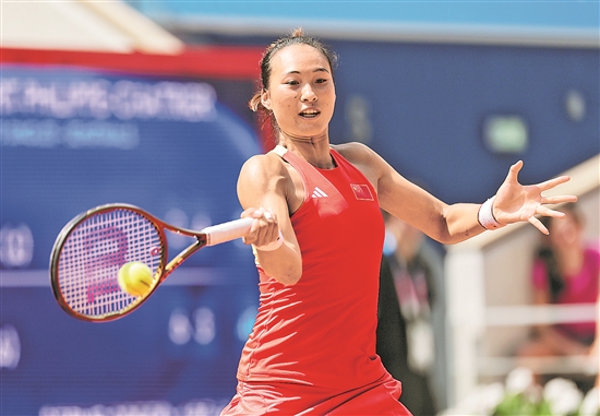 8月1日,在巴黎奧運會網(wǎng)球項目女子單打半決賽中,中國選手鄭欽文2比0戰(zhàn)勝波蘭選手斯瓦泰克,晉級決賽。圖為鄭欽文在比賽中。本報特派記者 楊登峰 攝