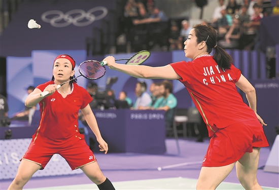 8月1日,在巴黎奧運會羽毛球女子雙打四分之一決賽中,中國組合陳清晨/賈一凡、譚寧/劉圣書分別戰(zhàn)勝各自對手,晉級半決賽。圖為陳清晨/賈一凡(右)在比賽中。新華社記者 陳斌 攝