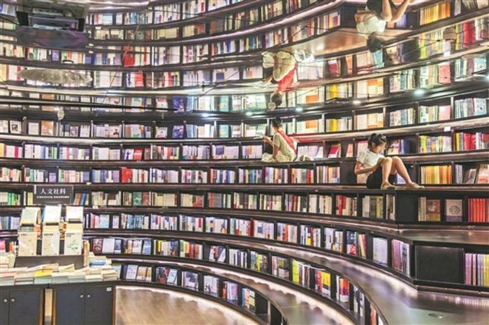 7月28日,浙江杭州,“網(wǎng)紅書(shū)店”鐘書(shū)閣,室內(nèi)空間大量運(yùn)用鏡面元素,營(yíng)造出亦真亦假的視覺(jué)效果。除了以白色圓柱書(shū)架為主的森林閱讀區(qū)、鏡面閱讀長(zhǎng)廊,還有天花板裝滿鏡子的環(huán)幕閱讀大廳,坐在書(shū)架臺(tái)階上的讀者仿佛“書(shū)海懸浮”。左冬辰 攝/視覺(jué)中國(guó)