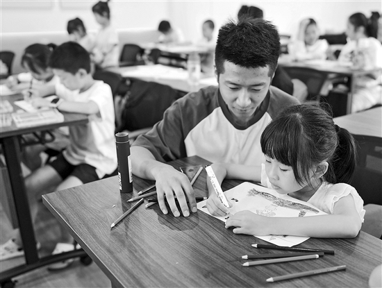 為解決外來務工家庭暑假“帶娃難”的問題,浙江湖州吳興區(qū)愛山街道整合企業(yè)工會、幸福鄰里等資源,開設“小候鳥”文明課堂,開展趣味手工、實踐體驗等課程,讓孩子們度過一個快樂暑假。圖為企業(yè)志愿者帶著“小候鳥”開展繪畫活動。