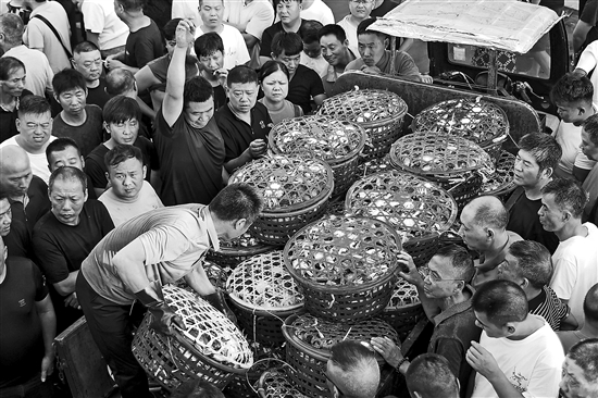 8月2日,浙江省舟山市普陀區(qū)舟山國際水產(chǎn)城碼頭,漁船歸來一派繁忙景象,工人們把漁船卸下來的梭子蟹運(yùn)往水產(chǎn)城內(nèi),準(zhǔn)備銷往各地市場。