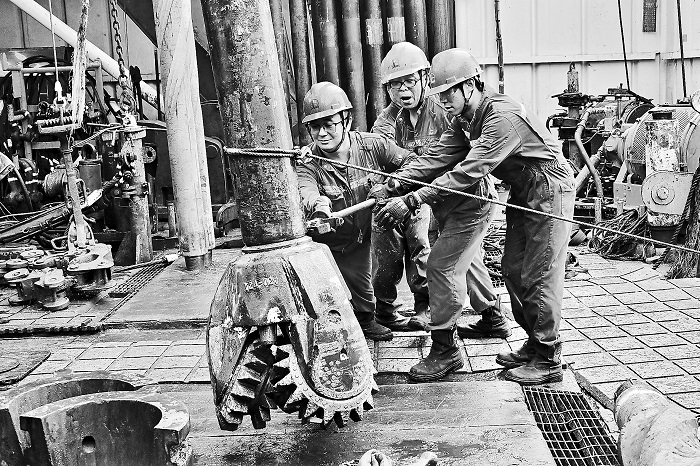 霧氣升騰的海面,在微弱的光線中顯得深邃而朦朧。鉆井作業(yè)區(qū)里,空氣中彌漫著機(jī)油和金屬的味道,機(jī)器的轟鳴聲、鋼鐵的撞擊聲和工人們的呼喊聲,一刻未停。