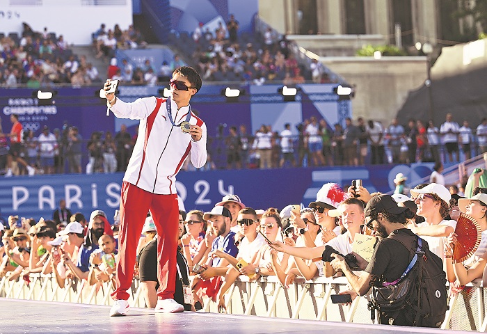8月5日,跳水男子雙人3米板金牌得主、中國(guó)選手龍道一在冠軍公園與觀(guān)眾互動(dòng)。新華社記者 賀燦鈴 攝