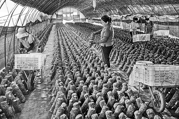 7月26日,河北隆化,蘑菇采摘工正在大棚里采摘蘑菇。