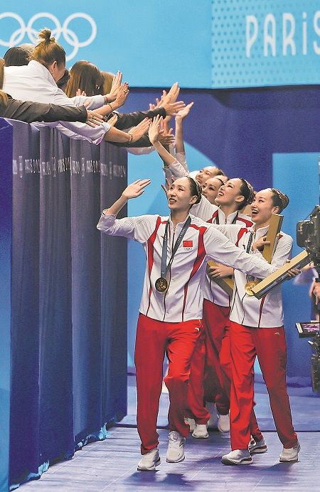 8月8日,中國(guó)隊(duì)獲得花樣游泳團(tuán)體賽冠軍。這是中國(guó)花樣游泳隊(duì)首次在奧運(yùn)賽場(chǎng)上奪得金牌。賽后隊(duì)員們與場(chǎng)邊觀眾互動(dòng)。