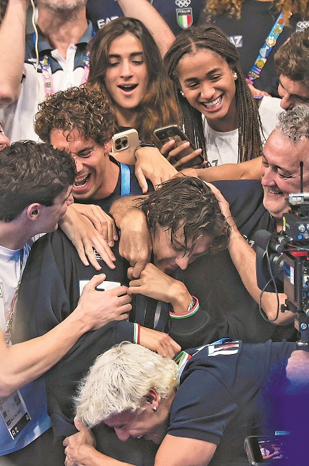 7月30日,意大利名將切孔獲得男子100米仰泳冠軍后被拉拉隊(duì)包圍慶祝。