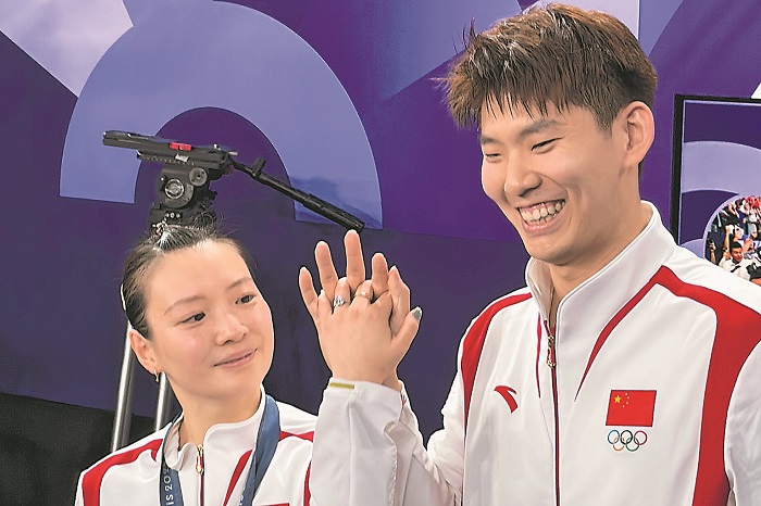 8月2日,中國(guó)選手黃雅瓊(左)和搭檔獲得羽毛球混雙金牌。領(lǐng)取獎(jiǎng)牌后,黃雅瓊在現(xiàn)場(chǎng)被中國(guó)男子羽毛球運(yùn)動(dòng)員劉雨辰(右)求婚。圖為二人現(xiàn)場(chǎng)向記者展示求婚戒指。