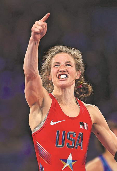 8月7日,摔跤女子自由式50公斤級(jí)半決賽,美國(guó)選手莎拉·安戰(zhàn)勝對(duì)手后慶祝勝利。