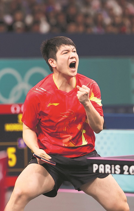 8月4日,中國(guó)選手樊振東在乒乓球男單決賽中慶祝得分。
