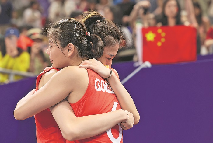 7月31日,在三人籃球女子分組循環(huán)賽中,中國(guó)隊(duì)?wèi)?zhàn)勝法國(guó)隊(duì)后高興地?fù)肀г谝黄稹?/p>