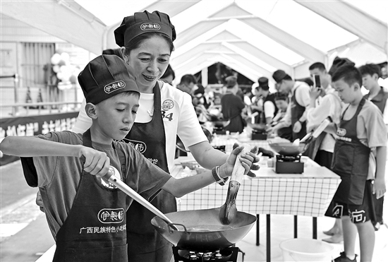8月10日,孩子和家長在南寧市第一職業(yè)技術(shù)學(xué)校學(xué)煮老友粉。當(dāng)日,廣西南寧市第一職業(yè)技術(shù)學(xué)校舉行老友粉研學(xué)活動,孩子和家長一起參觀廣西名小吃展示館、學(xué)習(xí)老友粉制作技藝,獨(dú)特的研學(xué)活動深受孩子和家長喜愛。新華社記者 周華 攝