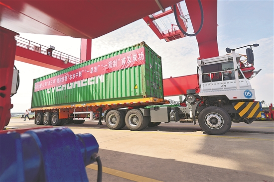 “勝濤668合肥”此次出發(fā)標(biāo)志著合肥-上?!肮D(zhuǎn)水”首航成功,合肥造“新三樣”貨物水路運(yùn)輸實(shí)現(xiàn)了“一程申報(bào)、一單到底、一箱到底”的“一站式”運(yùn)輸。與原先的公路運(yùn)輸相比,如今的水路運(yùn)輸物流成本下降約15%。本報(bào)通訊員 陳家樂 攝