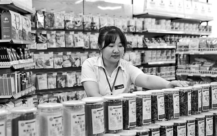 8月14日,工作人員在位于遼寧省朝陽(yáng)市的喀左站的便利店中碼放鄉(xiāng)村特色農(nóng)副商品。